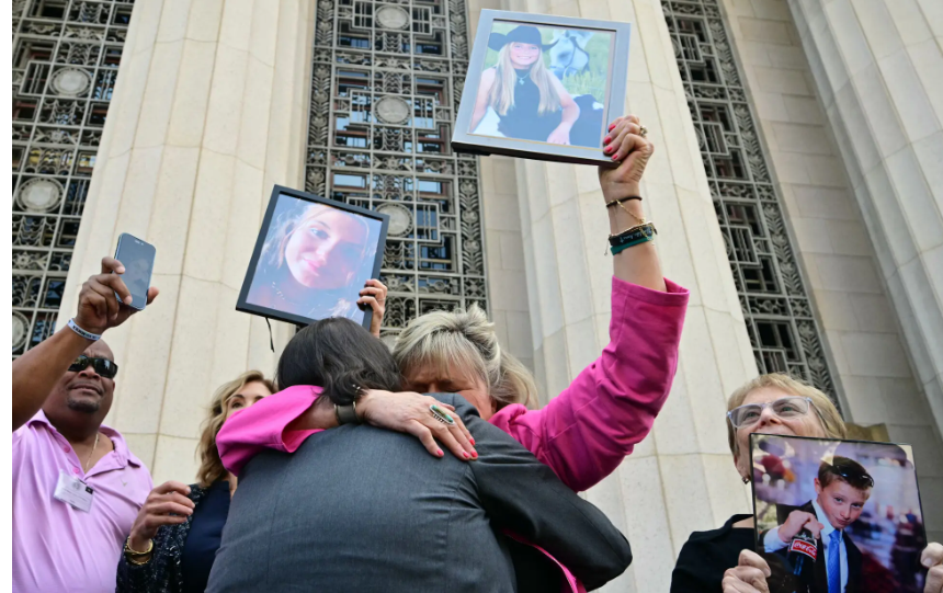 Parents celebrating the ruling by holding pictures of the children whose deaths they blame on social media.
